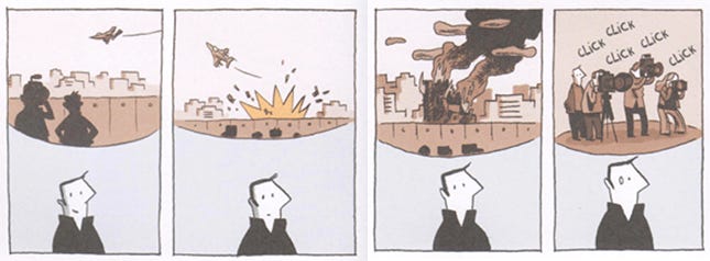 Below, Guy Delisle masterfully demonstrates emotion on a face that really only has two dots and a line–and he shows how to transition from one emotion to another in this four panel excerpt from Jerusalem: Chronicles from a Holy City.