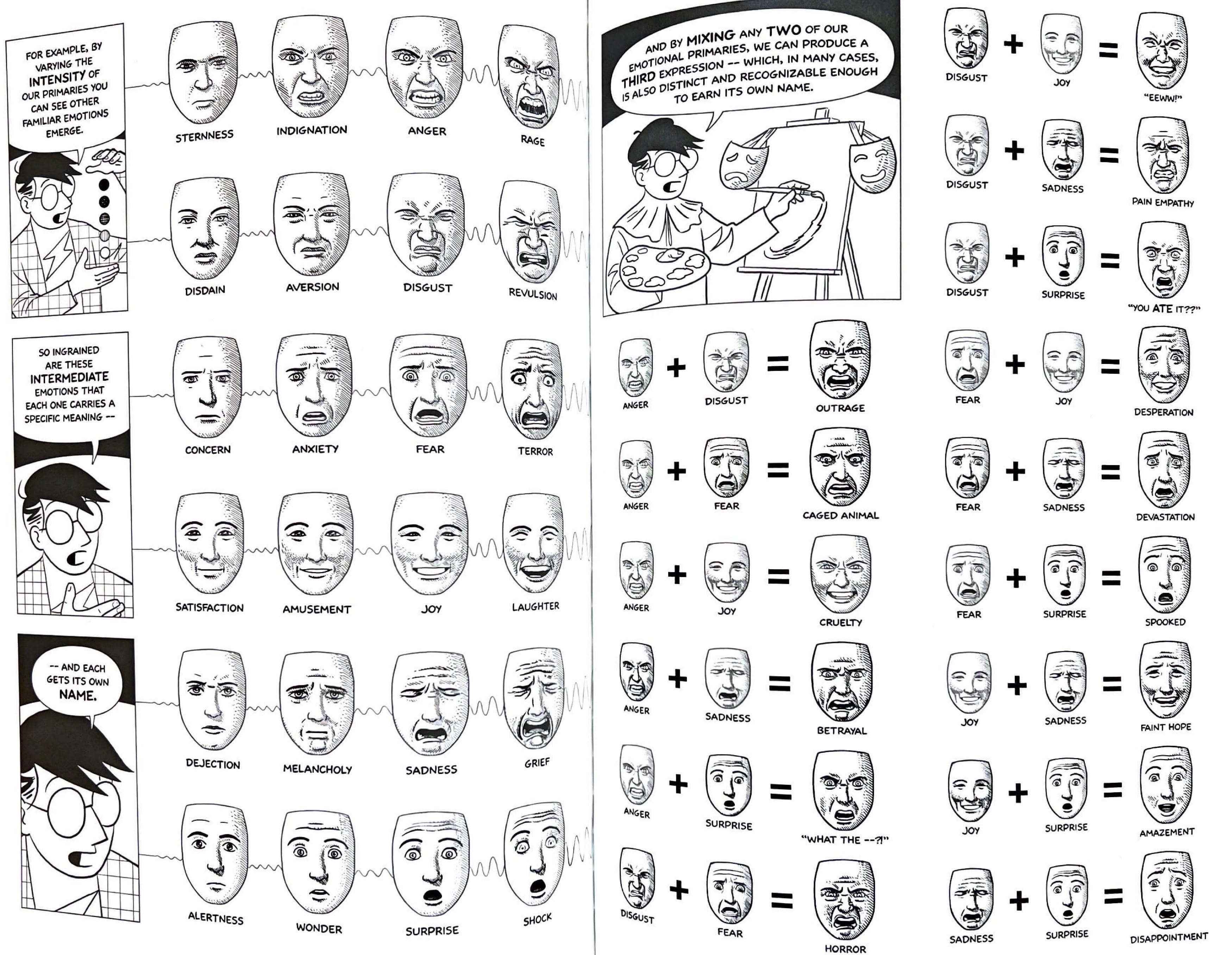 Obviously in this example and others, our understanding of the expression is augmented by the rest of the panel—we interpret the juxtaposition of images; we visually read a scene. Perhaps that’s a great argument not to have only “talking heads” in panels, and instead add the visual complexity to transfer emotion and tap into reader empathy. It’s also important to note that we rarely read a stand-alone panel. That said, many of the emotions conveyed in the examples below are panels out of context, with a few common and complex emotions wonderfully expressed. We’ve chosen a variety of visual styles, but all of them are “cartoony,” embracing the visual language of comics.