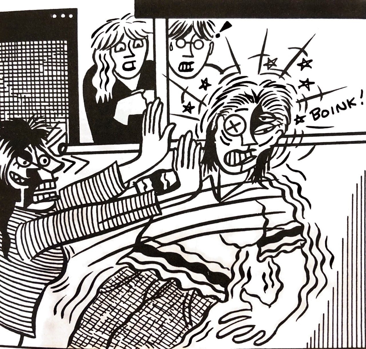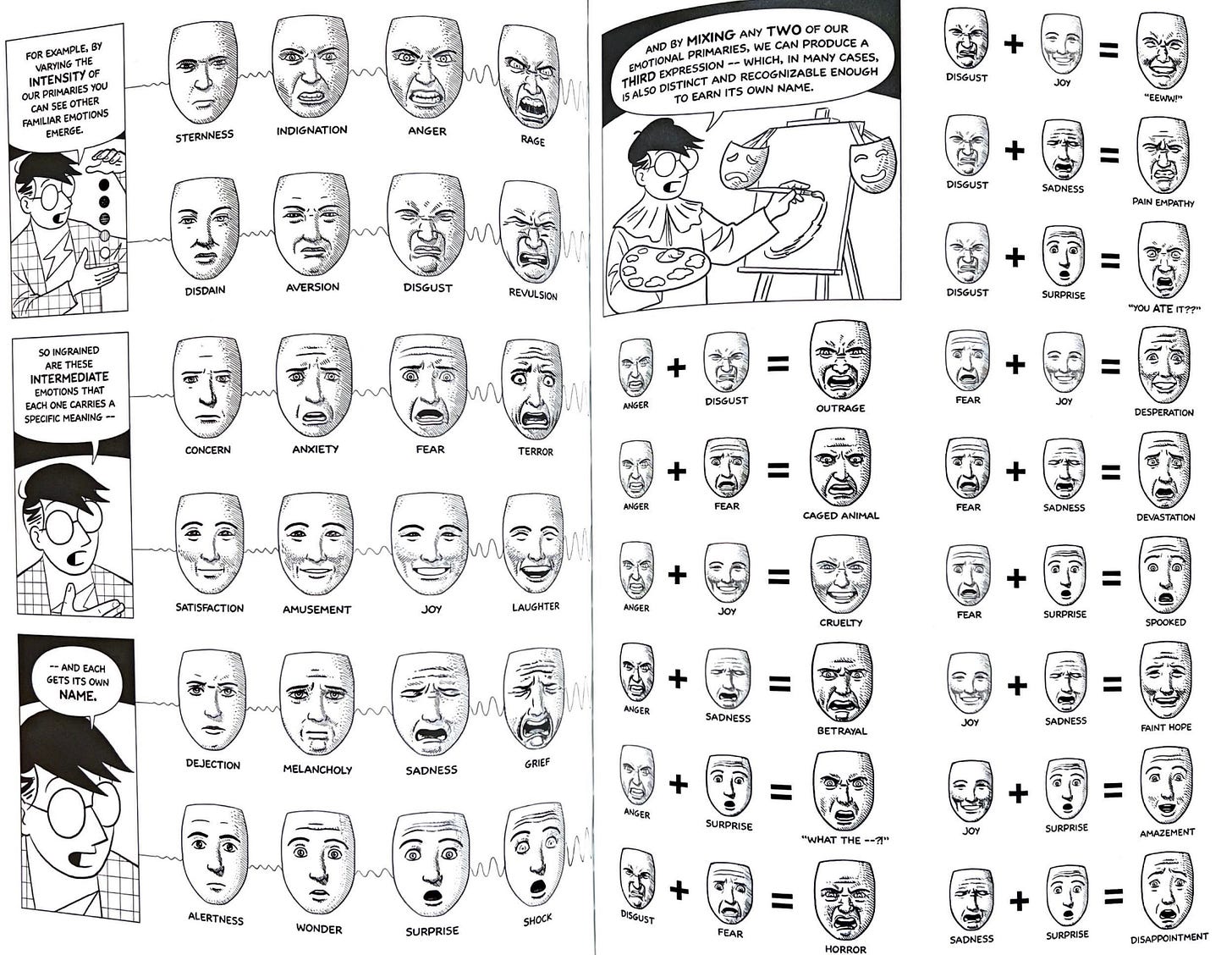 In our classes, the students have been asking about how to draw emotions. One of the texts that Amaris used earlier in the semester was Scott McCloud’s Making Comics, which does a good job of showing how to render a variety of emotions (and then gets a little goofy by trying to create a formula for various expressions), but her students were looking for something simpler, more “cartoony” and perhaps more approachable, so we’re revisiting some favorite artists to see how they are drawing readable expressions.