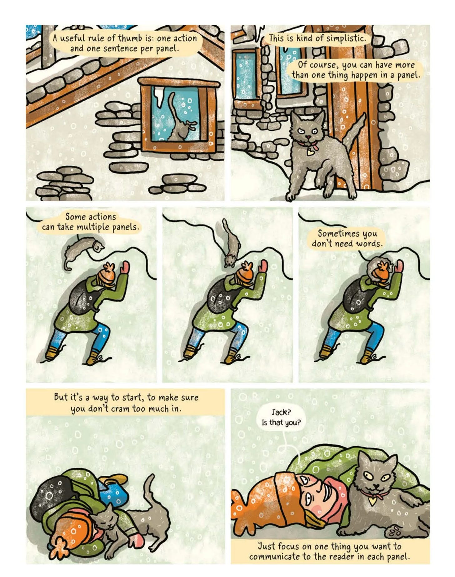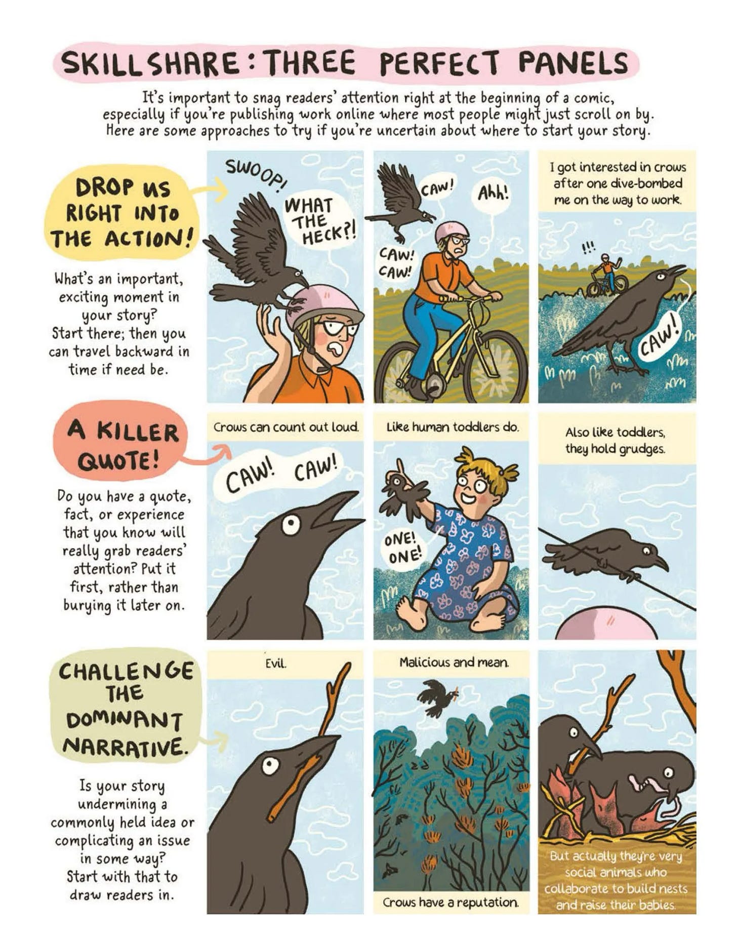 SHAY: I really learned how to write nonfiction comics at the Nib and then putting together Guantanamo Voices was a crucible—I had to take very complicated stories and figure out how to tell them visually on a tight deadline and with a limited page-count. That experience was super helpful in making this book because we had *so much* we wanted to say and figuring out how to squeeze it into the limited page-count was a puzzle. One place you really see that experience come through is there’s a skill-share page called “Three Perfect Panels” that’s about three punchy ways to begin a comic. Each approach is a way to grab readers’ attention quickly. As much as artists want to meander to their point, especially if you’re publishing comics online, you have to keep in mind that the audience’s attention span is limited so they need a compelling reason to dig into your comic.